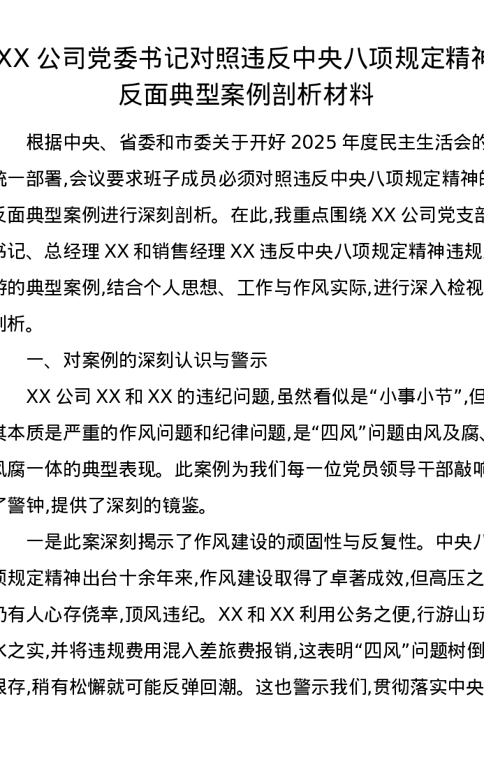 XX公司党委书记对照违反中央八项规定精神反面典型案例剖析材料