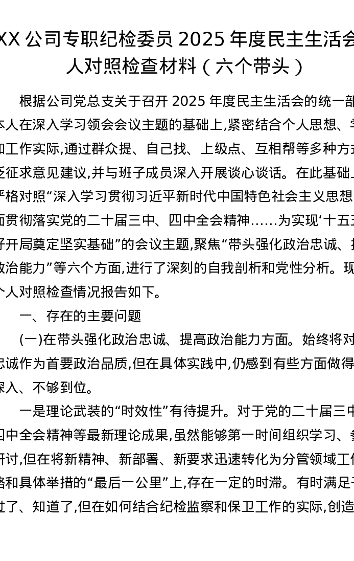 XX公司专职纪检委员2025年度xxxxx个人对照检查材料(六个带头)