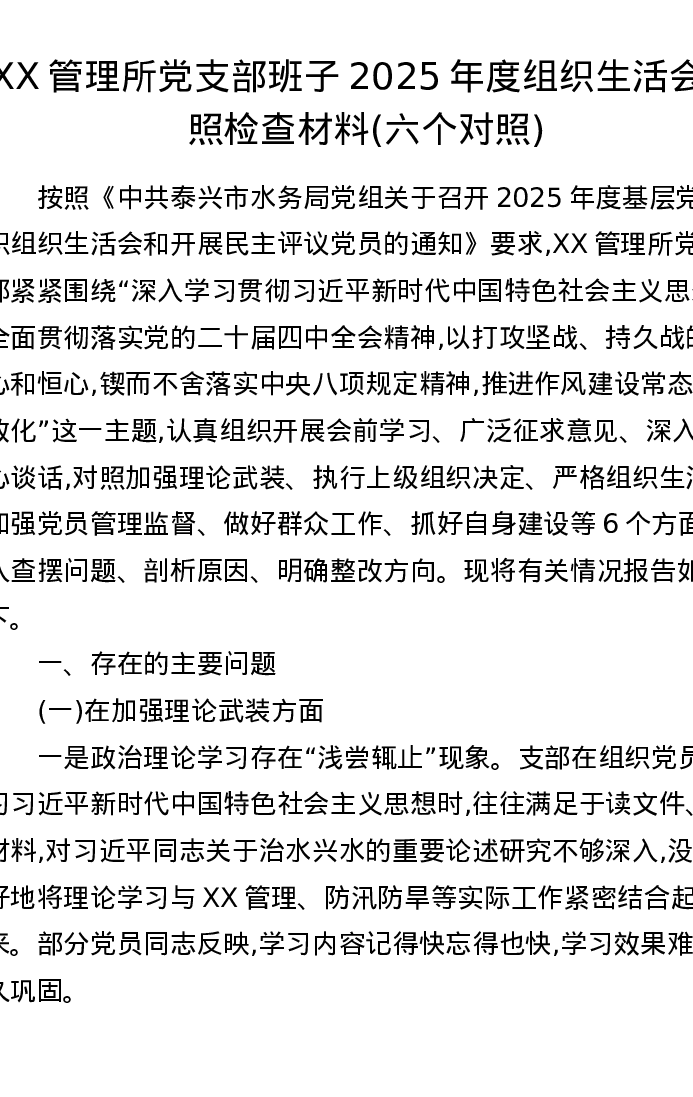 XX管理所党支部班子2025年度组织xxx对照检查材料(六个对照)