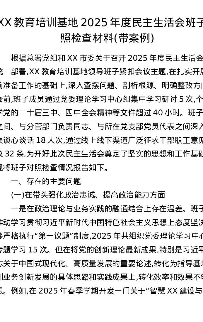XX教育培训基地2025年度xxxxx班子对照检查材料(带案例)