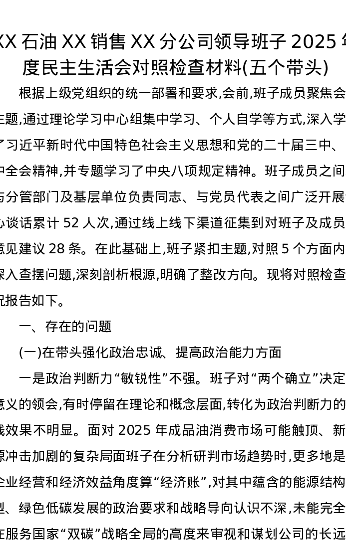 XX石油XX销售XX分公司领导班子2025年度xxxxx对照检查材料(五个带头)