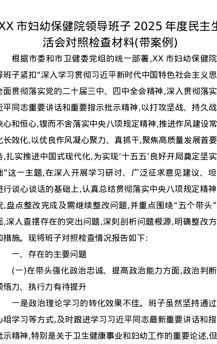 XX市妇幼保健院领导班子2025年度xxxxx对照检查材料(带案例)