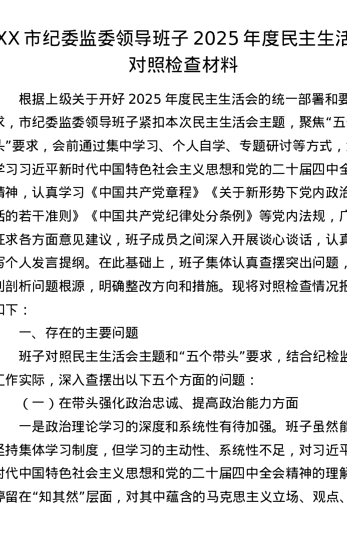 XX市纪委监委领导班子2025年度xxxxx对照检查材料