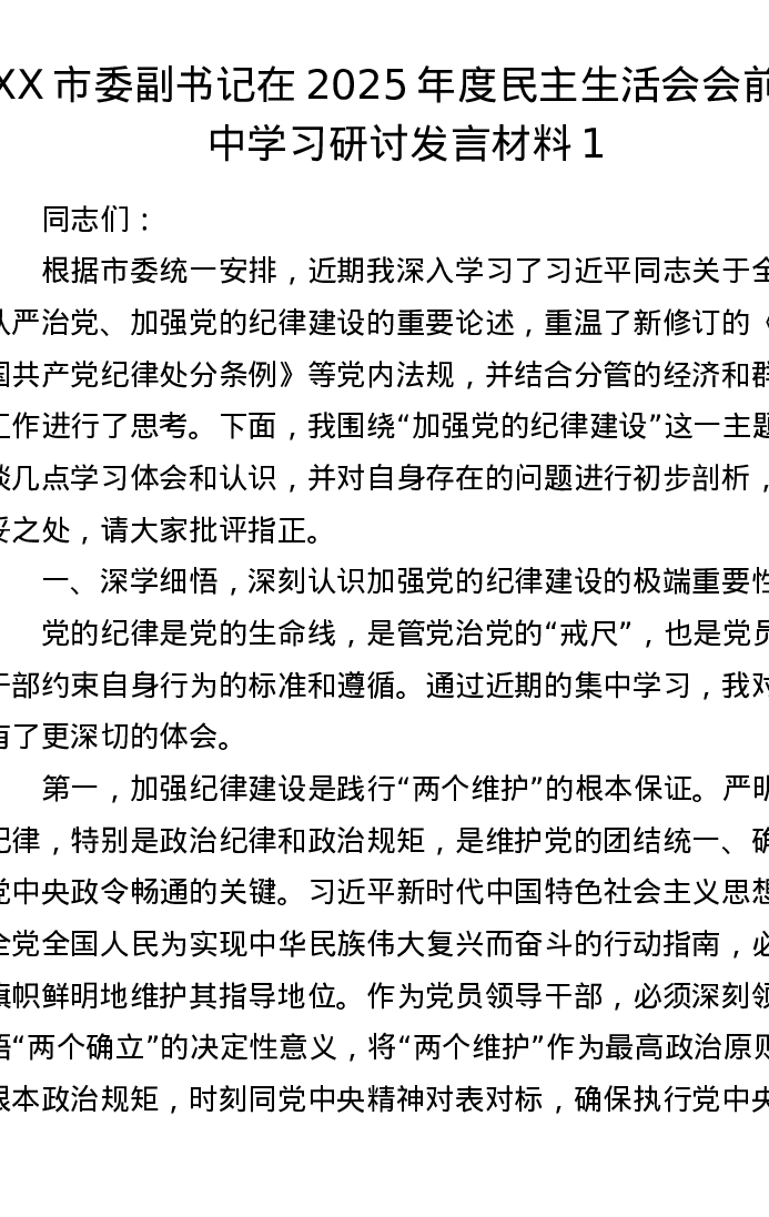 XX市委副书记在2025年度xxxxx会前集中学习研讨发言材料1