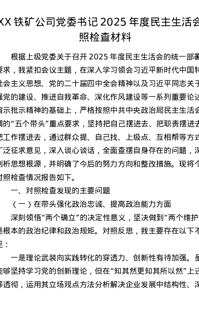 XX铁矿公司党委书记2025年度xxxxx对照检查材料