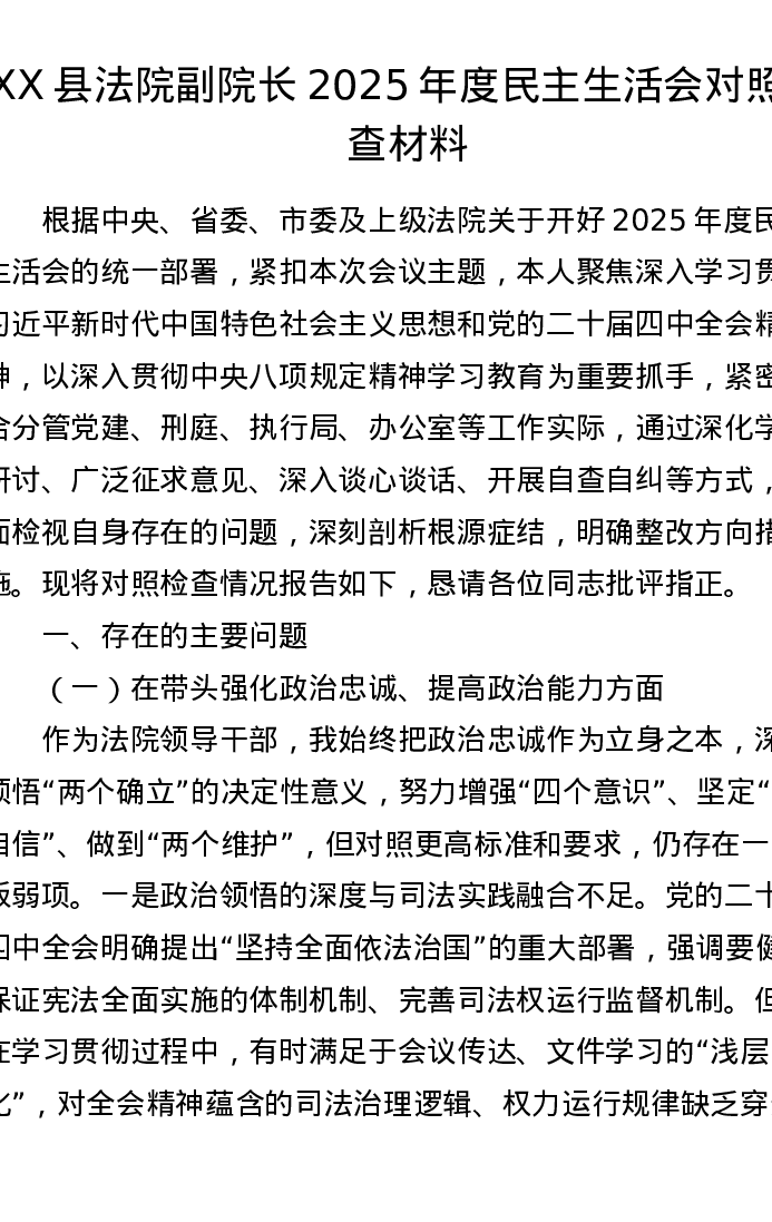 XX县法院副院长2025年度xxxxx对照检查材料