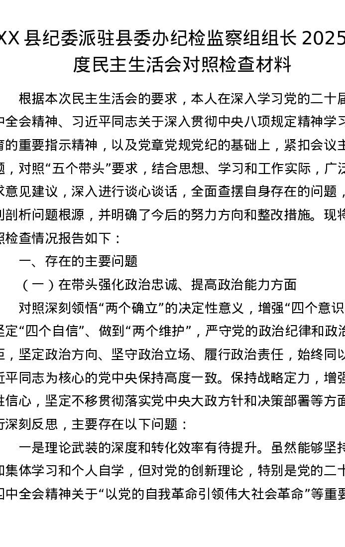 XX县纪委派驻县委办纪检监察组组长2025年度xxxxx对照检查材料