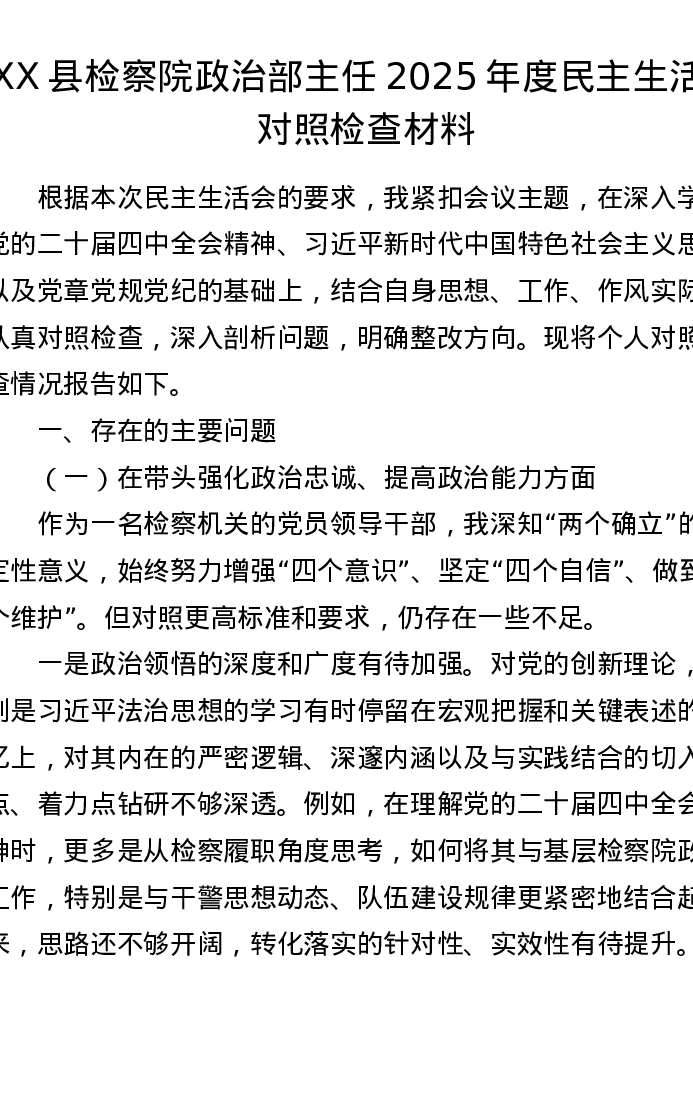 XX县检察院政治部主任2025年度xxxxx对照检查材料