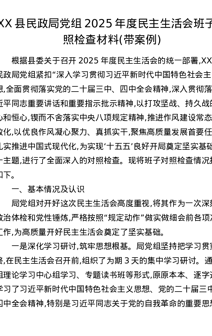 XX县民政局党组2025年度xxxxx班子对照检查材料(带案例)