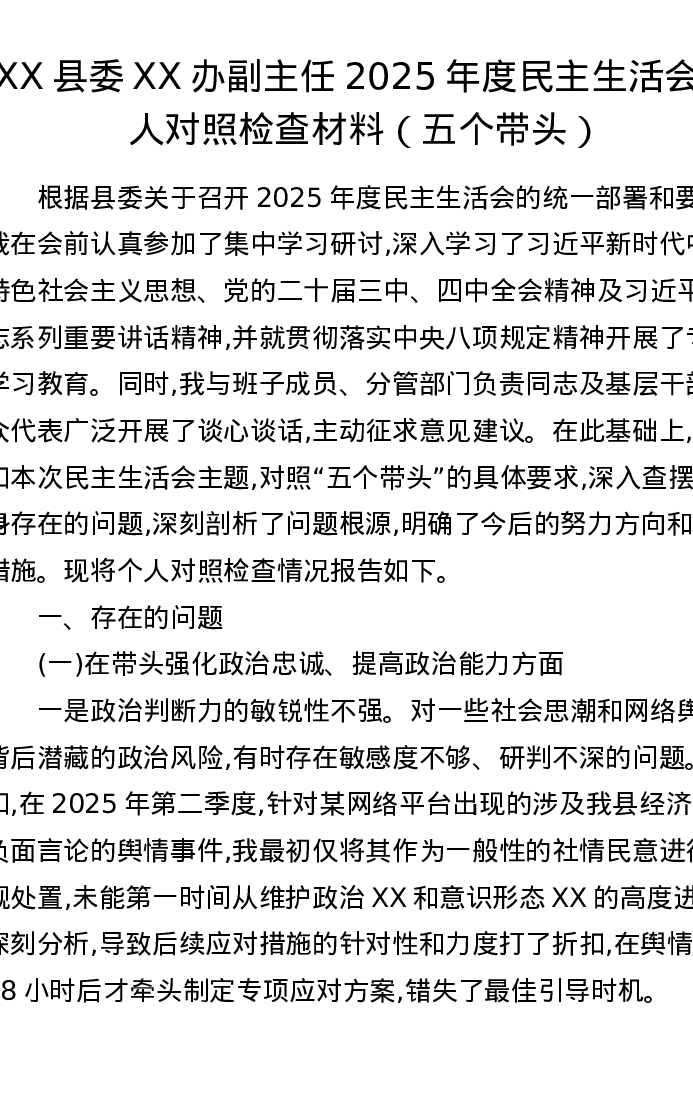 XX县委XX办副主任2025年度xxxxx个人对照检查材料(五个带头)