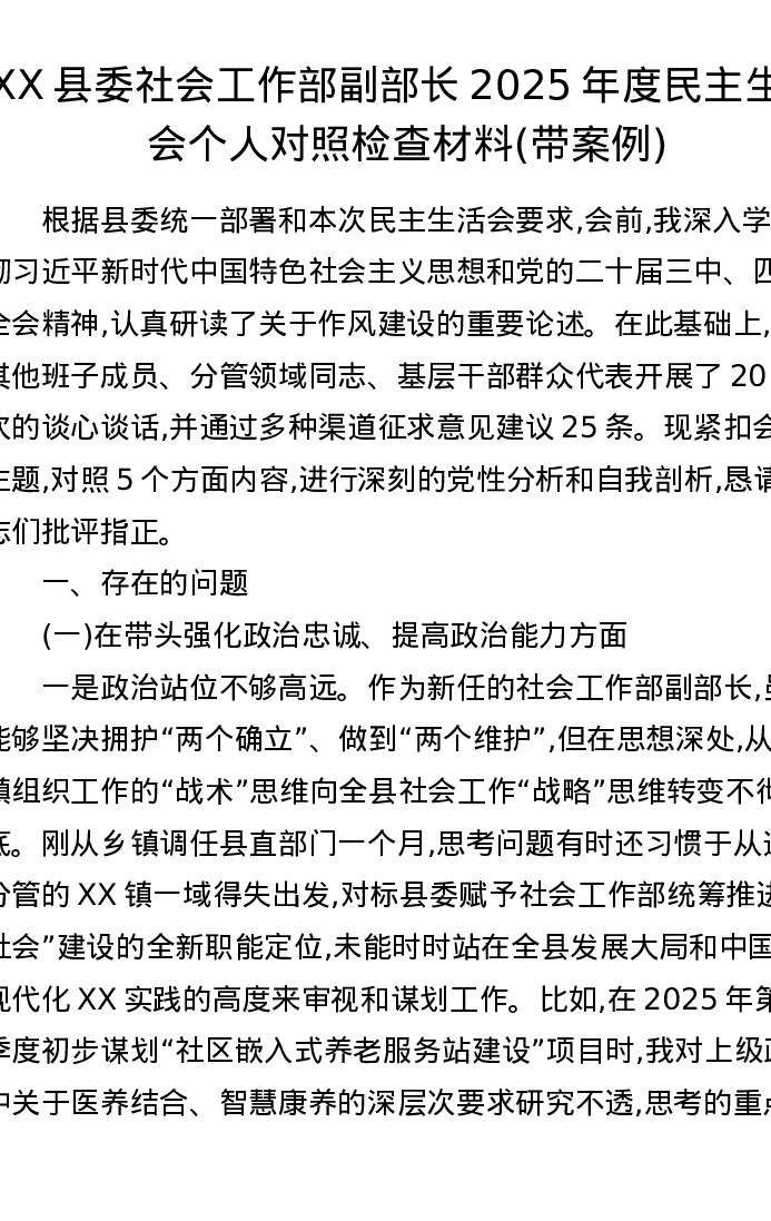 XX县委社会工作部副部长2025年度xxxxx个人对照检查材料(带案例)