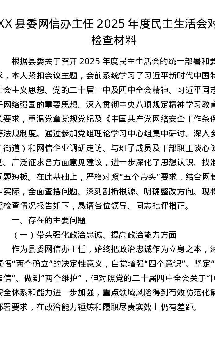 XX县委网信办主任2025年度xxxxx对照检查材料