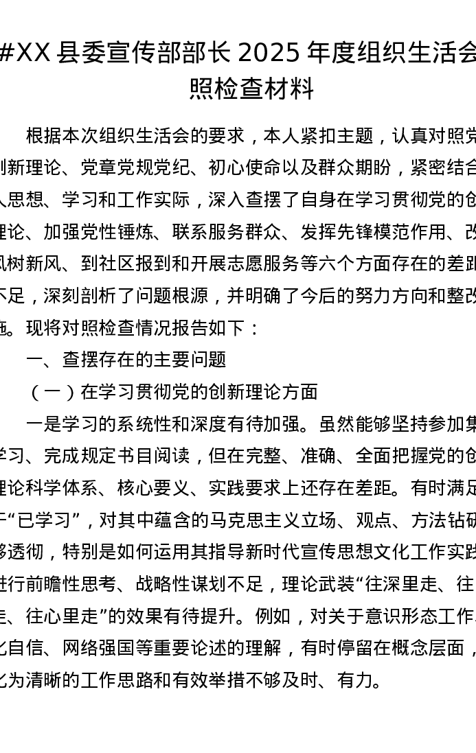 XX县委宣传部部长2025年度组织xxx对照检查材料