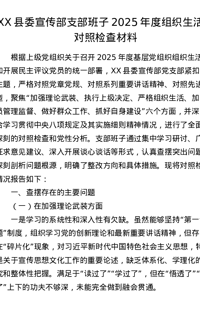 XX县委宣传部支部班子2025年度组织xxx对照检查材料
