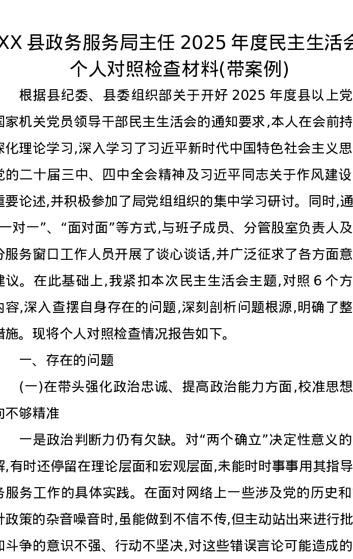 XX县政务服务局主任2025年度xxxxx个人对照检查材料(带案例)