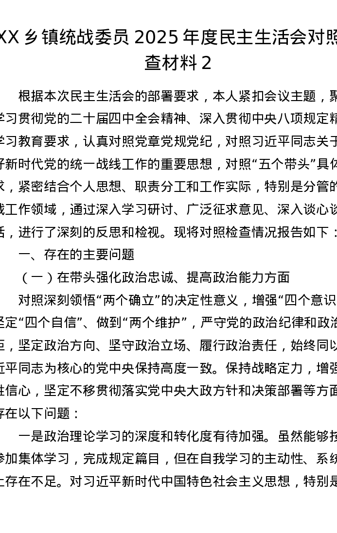 XX乡镇统战委员2025年度xxxxx对照检查材料2