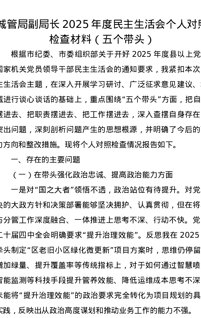 城管局副局长2025年度xxxxx个人对照检查材料(五个带头)