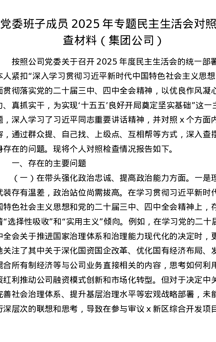 党委班子成员2025年专题xxxxx对照检查材料(集团公司)