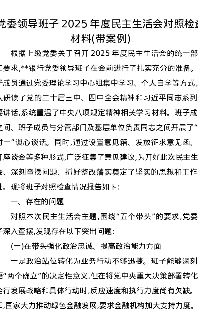 党委领导班子2025年度xxxxx对照检查材料(带案例)
