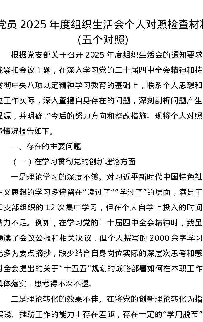 党员2025年度组织xxx个人对照检查材料(五个对照)