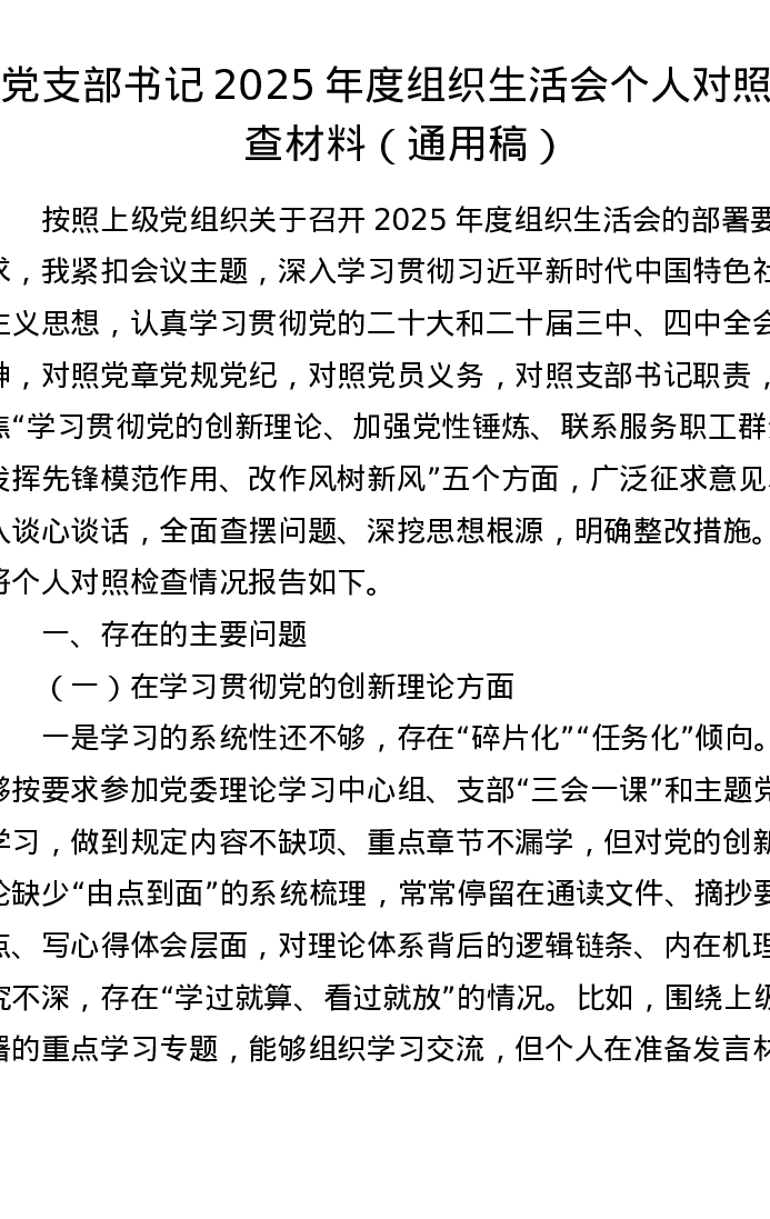 党支部书记2025年度组织xxx个人对照检查材料(通用稿)