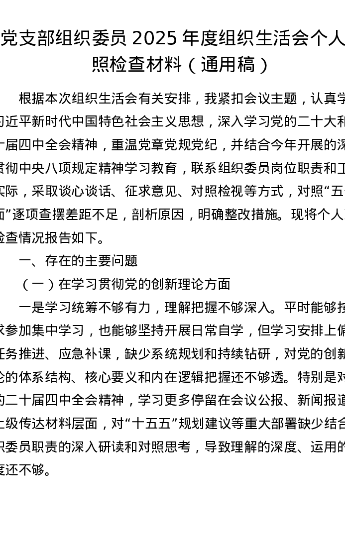 党支部组织委员2025年度组织xxx个人对照检查材料(通用稿)