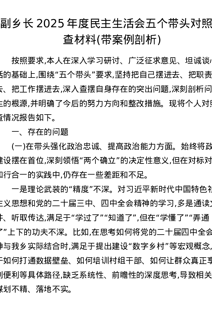 副乡长2025年度xxxxx五个带头对照检查材料(带案例剖析)