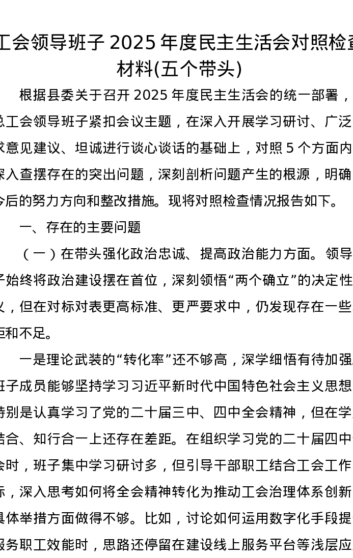 工会领导班子2025年度xxxxx对照检查材料(五个带头)