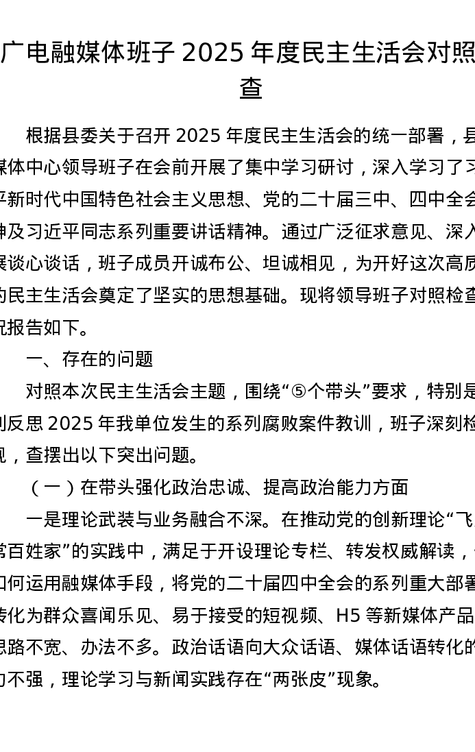 广电融媒体班子2025年度xxxxx对照检查