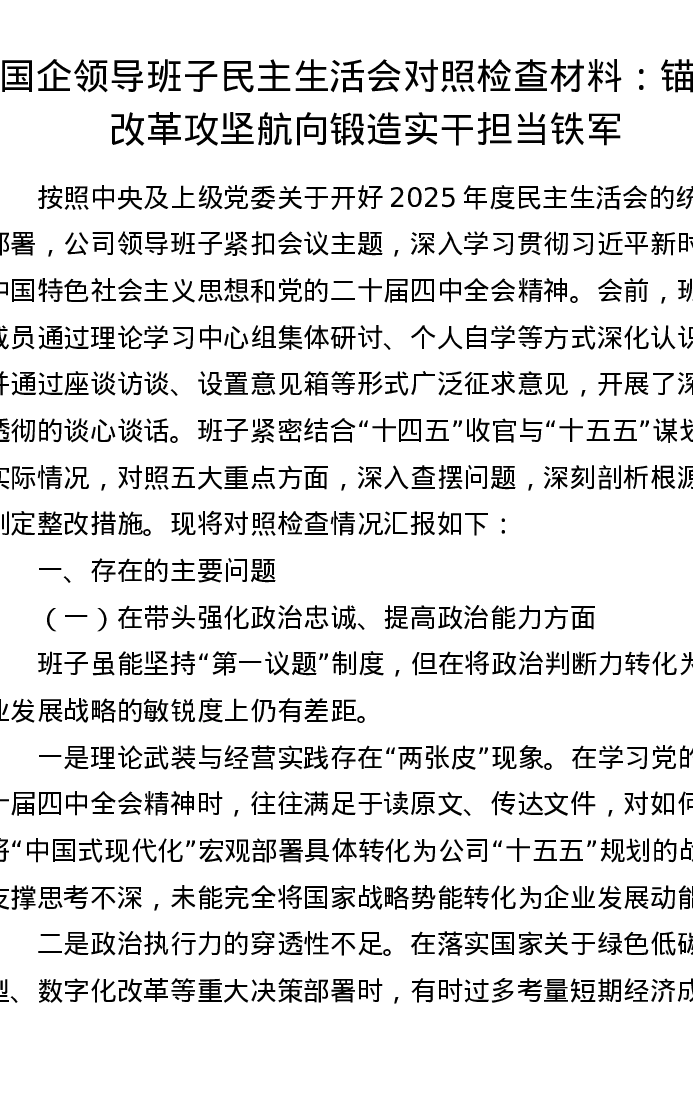 国企领导班子xxxxx对照检查材料:锚定改革攻坚航向 锻造实干担当铁军