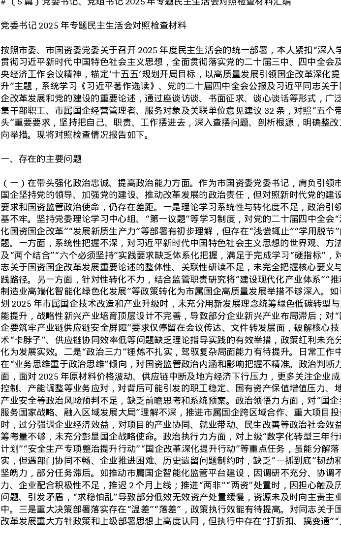 汇编:党委书记、党组书记2025年专题xxxxx对照检查5篇