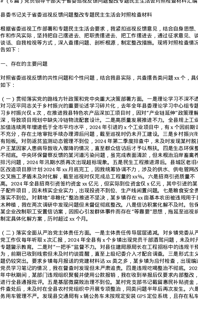 汇编:党员领导干部关于省委巡视反馈问题整改专题xxxxx对照检查材料6篇
