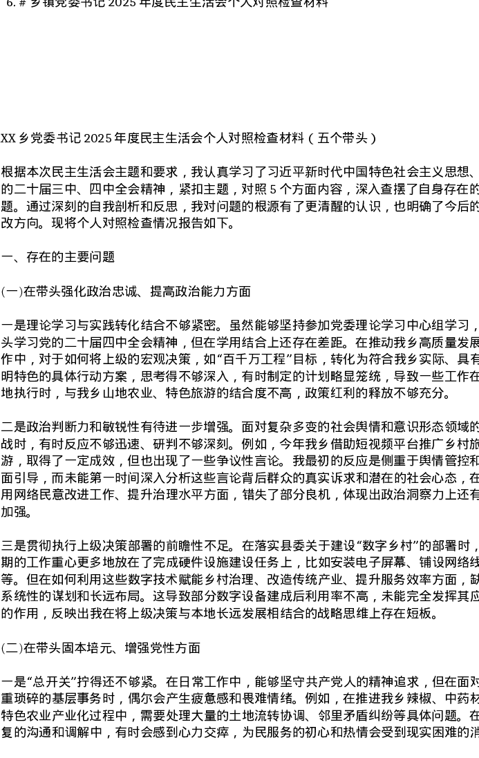 汇编:乡镇党委书记2025年度xxxxx个人对照检查材料6篇