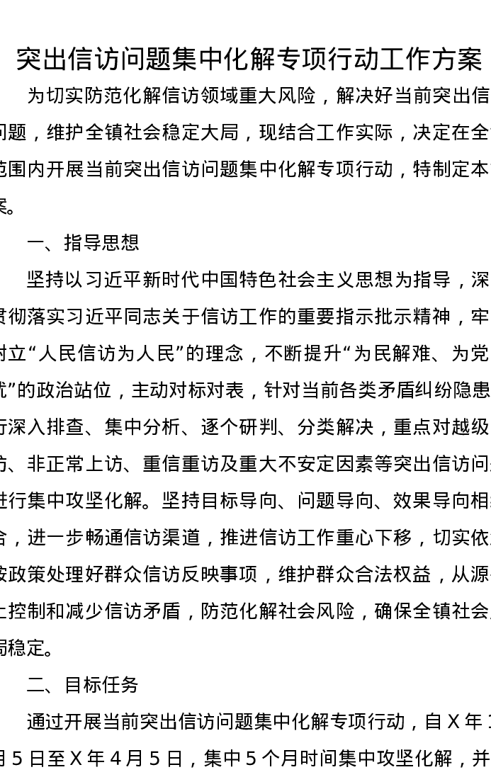 突出信访问题集中化解专项行动工作方案