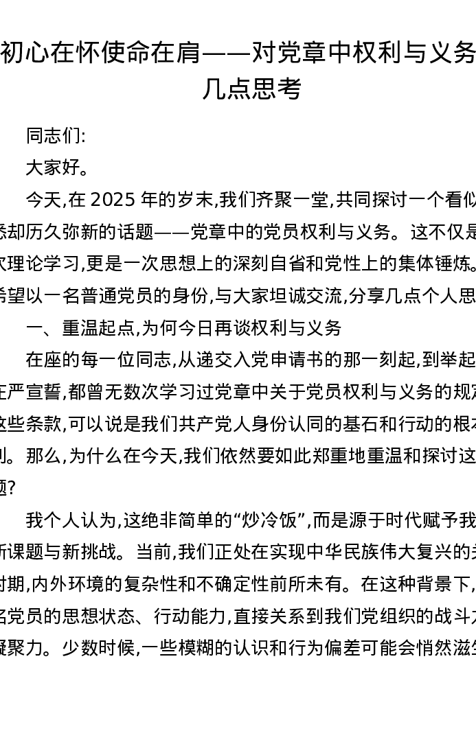 初心在怀使命在肩——对党章中权利与义务的几点思考
