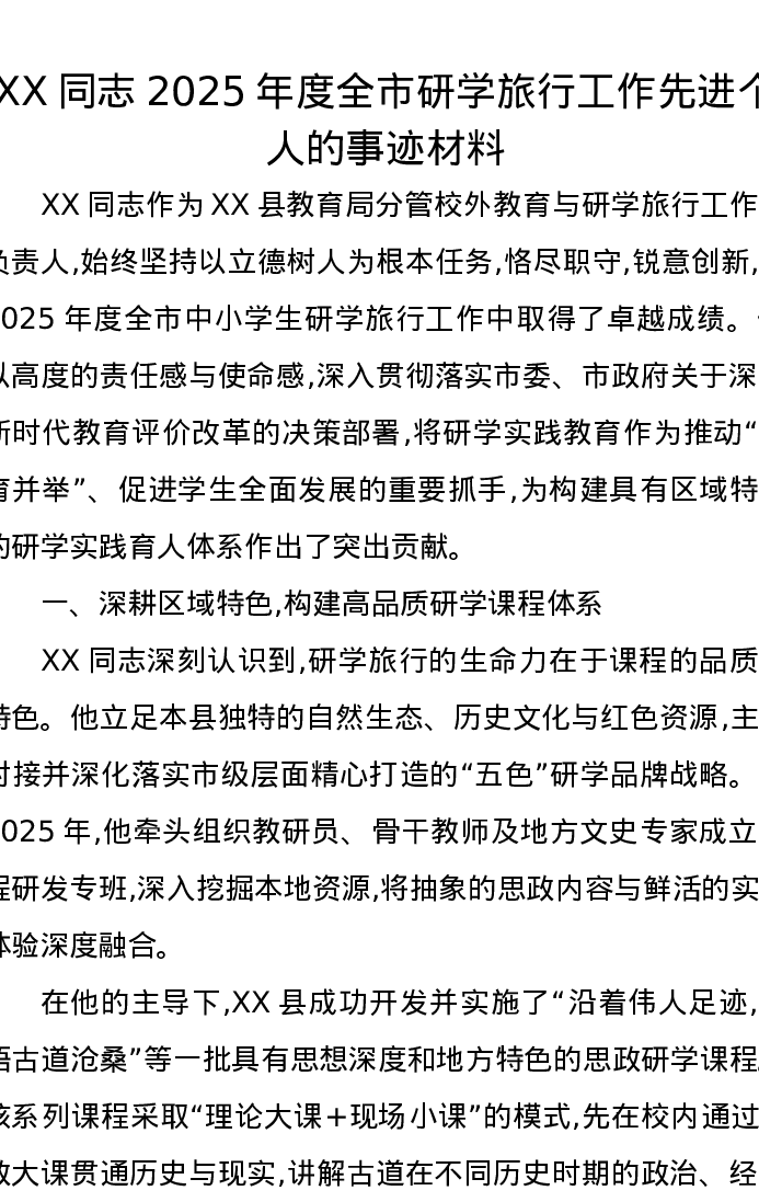 XX同志2025年度全市研学旅行工作先进个人的事迹材料