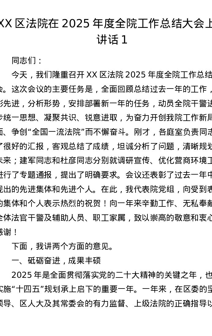 XX区法院在2025年度全院工作总结大会上的讲话1