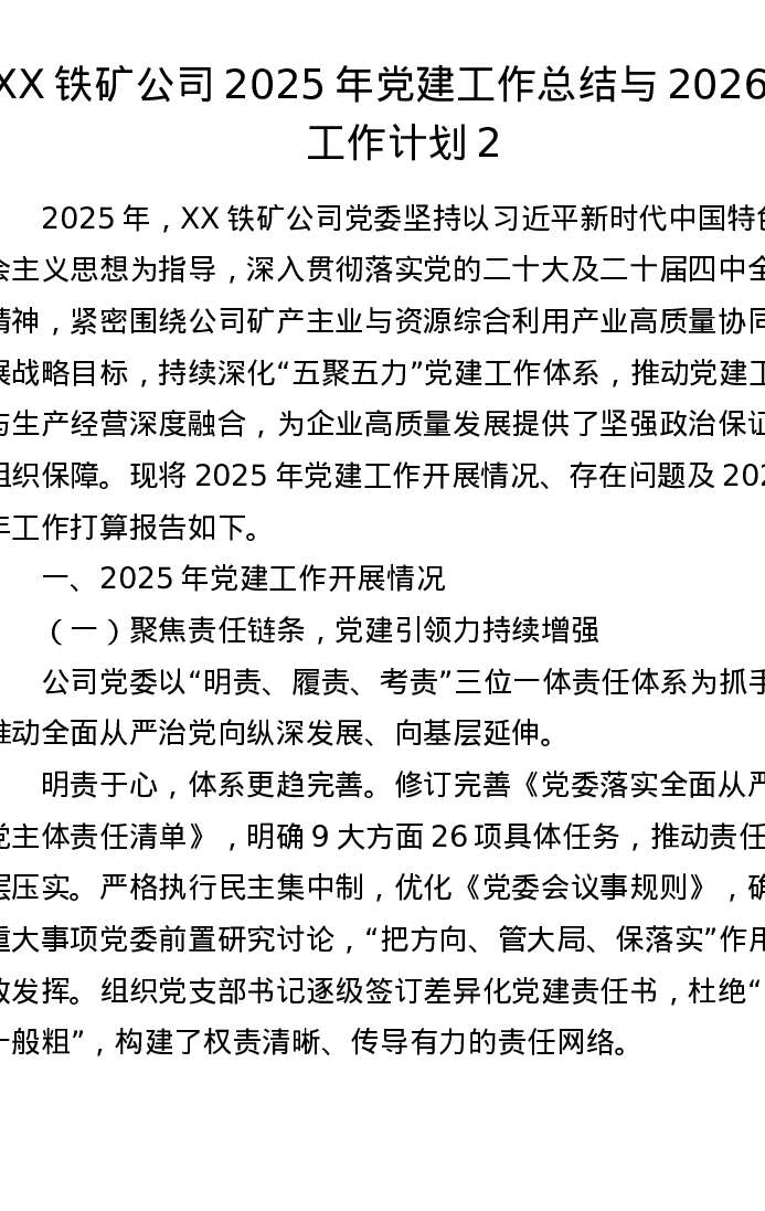 XX铁矿公司2025年党建工作总结与2026年工作计划2