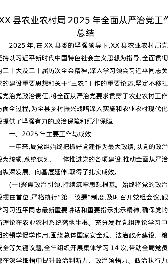 XX县农业农村局2025年全面从严治党工作总结
