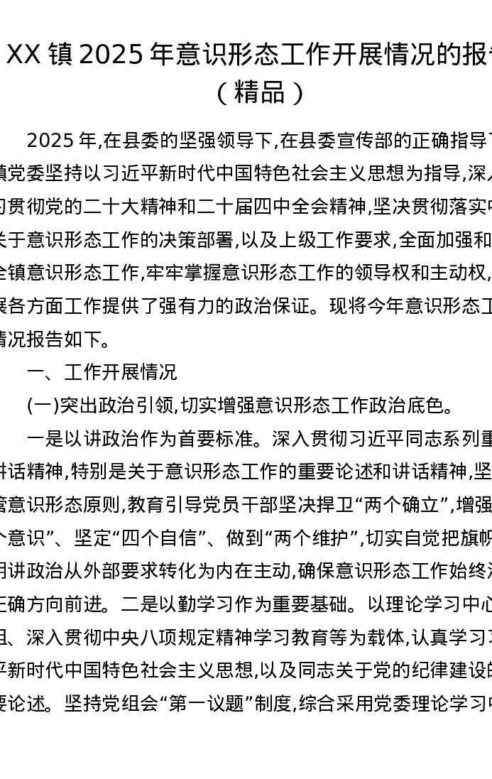 XX镇2025年意识形态工作开展情况的报告