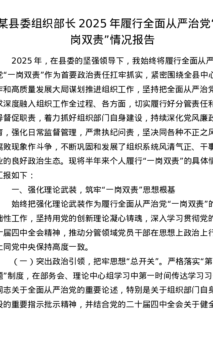 某县委组织部长2025年履行全面从严治党一岗双责情况报告