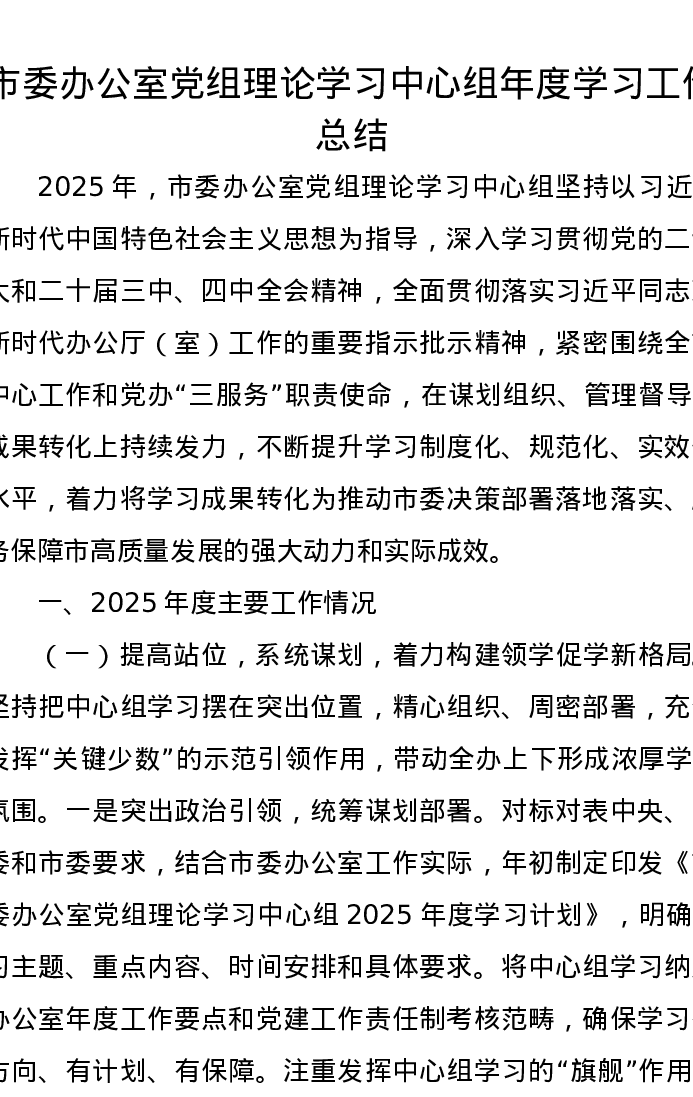 市委办公室党组理论学习中心组年度学习工作总结