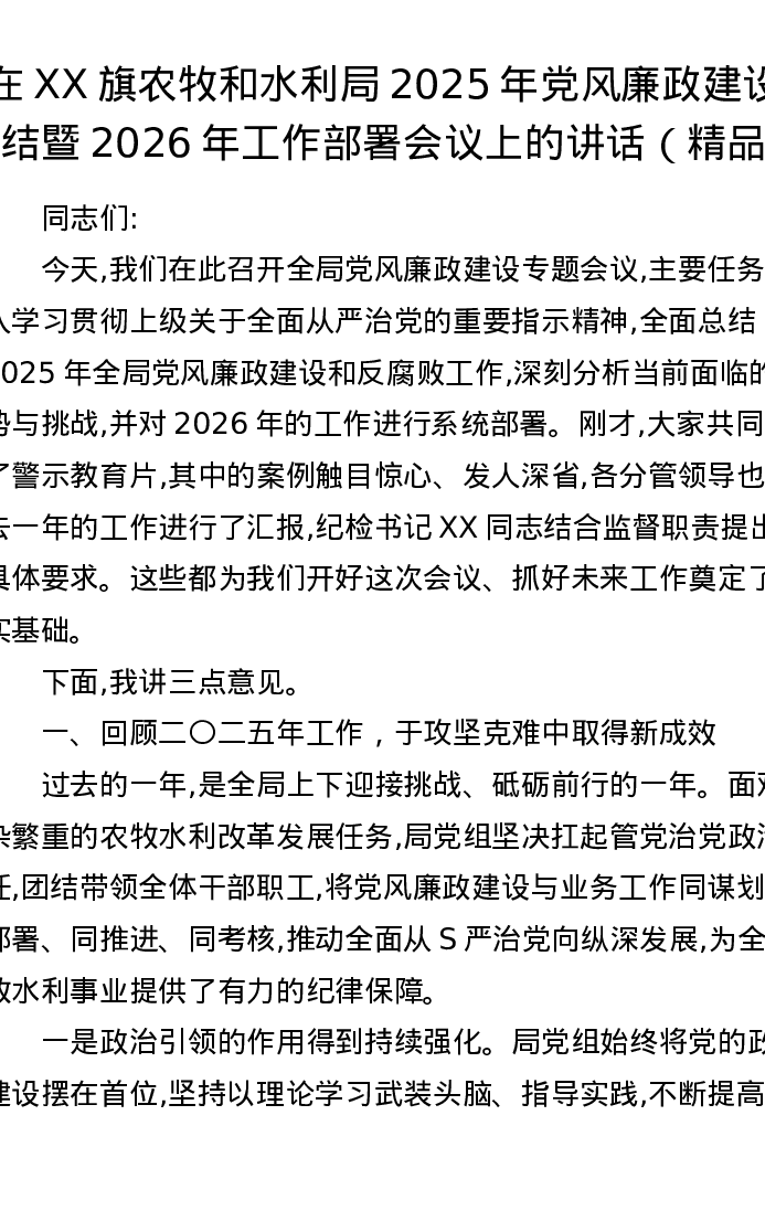 在XX旗农牧和水利局2025年党风廉政建设总结暨2026年工作部署会议上的讲话