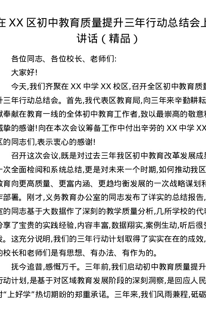 在XX区初中教育质量提升三年行动总结会上的讲话