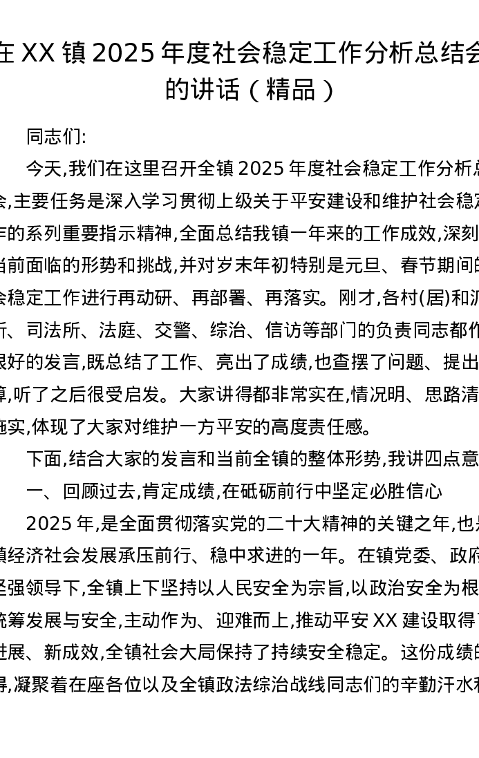 在XX镇2025年度社会稳定工作分析总结会上的讲话