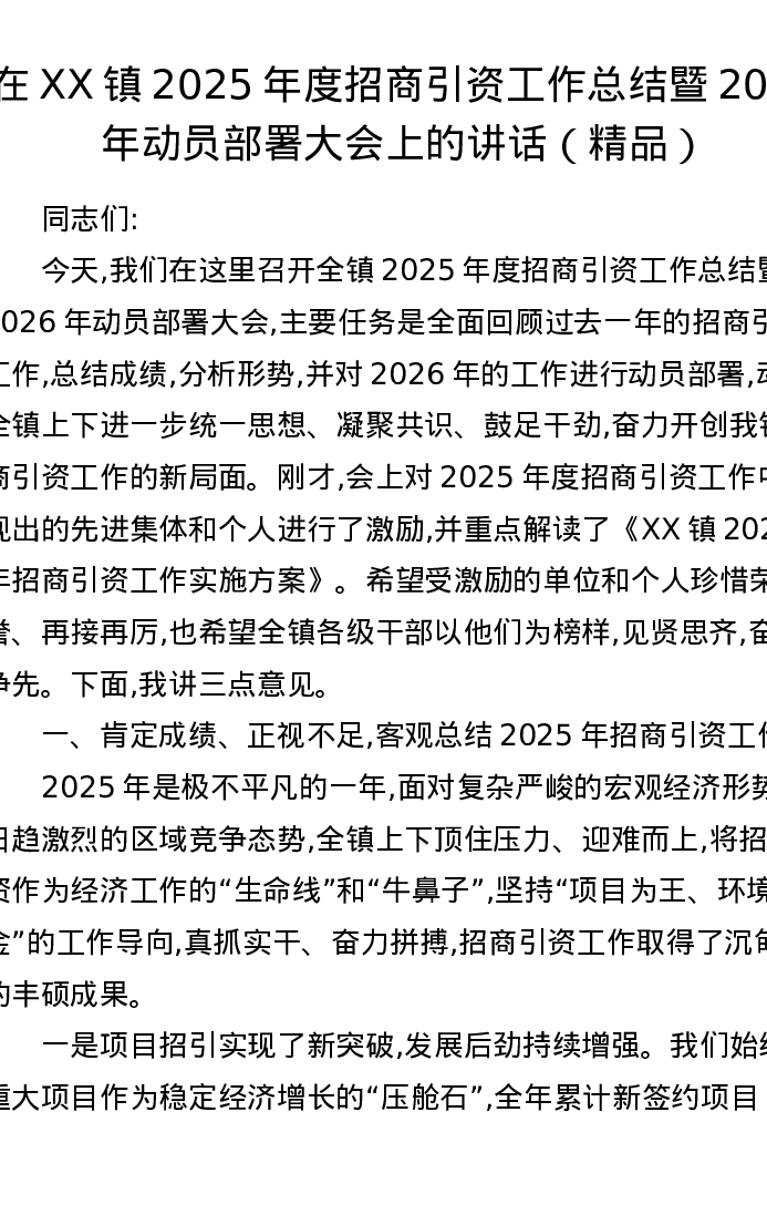 在XX镇2025年度招商引资工作总结暨2026年动员部署大会上的讲话