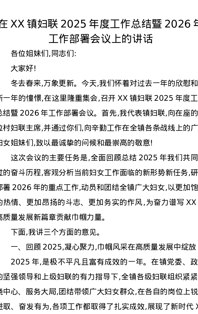 在XX镇妇联2025年度工作总结暨2026年工作部署会议上的讲话