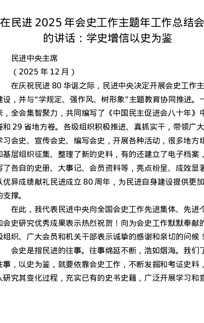 在民进2025年会史工作主题年工作总结会上的讲话:学史增信以史为鉴