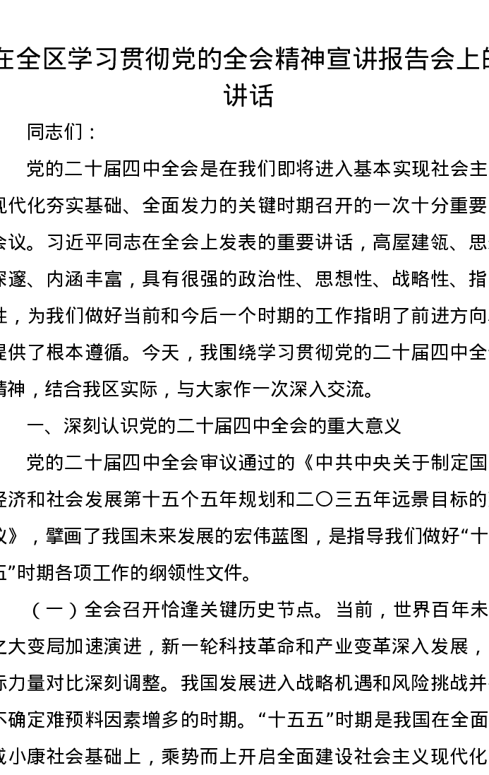 在全区学习贯彻党的二十届四中全会精神宣讲报告会上的讲话