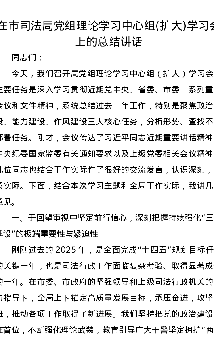 在市司法局党组理论学习中心组(扩大)学习会上的总结讲话